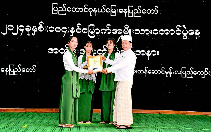 Awards were then presented by Nay Pyi Taw Council Chair U Than Tun Oo and Council Member U Myint Soe to winners of essay and poetry competitions held for middle and high school students in honour of the 104th National Victory Day.