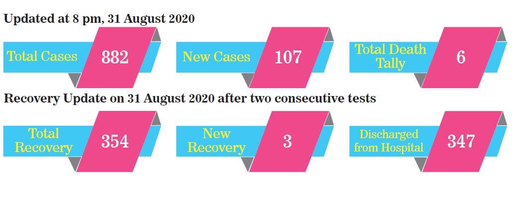 MYANMAR’S COVID-19 positive cases rise to 882 after 107 new cases were reported on 31 August according to Ministry of Health and Sports. Among these 882 confirmed cases, six died, 354 have recovered, 347 have been discharged from hospitals and 61 were held under investigation.—MNA