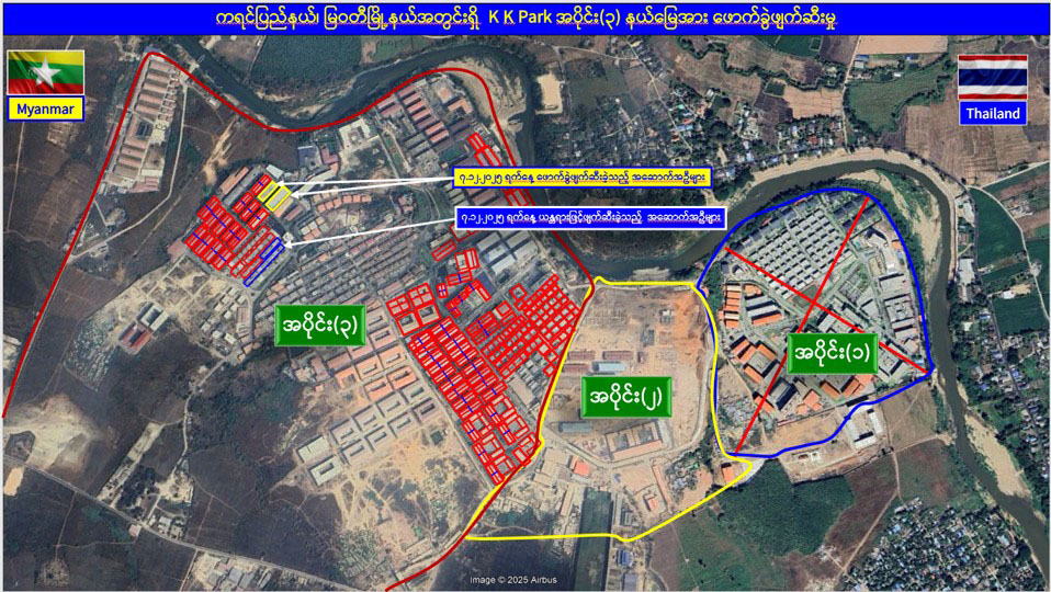 Yesterday, the combined team dissolved 12 more illegal buildings — two four-storey buildings and 10 two-storey buildings used in telecom fraud and online gambling activities in Myawady-Maethawtalay (KK Park) area. Hence, a total of 333 buildings out of 635 illegal buildings have been so far demolished in KK Park area.