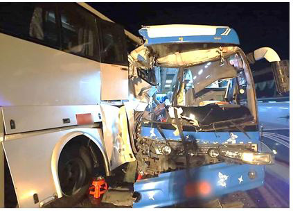 The accident happened when a passenger bus named Minthitsa hit the left side of the rare part of another passenger bus named Shwezin Satkya that abruptly stopped on the inside lane. The two buses moving in the same direction were damaged in the accident. At least 16 people- three from Shwezin Satkya passenger bus and 13 from Minthitsa passenger bus- were injured in the incident.