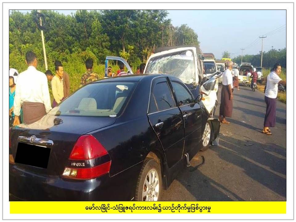 The accident occurred between mileposts 22 and 22/1 on the Thanbyuzayet-Mawlamyine Road near Nyaunggon Village at around 8:30 a.m. on 11 November. A Mark II car driven by a man named Mon Chan, 23 years old was on the way to Mawlamyine from Thanbyuzayet and collided with a minibus with 16 people on board coming from an opposite direction while attempting to overtake another car. 16 people from the minibus were hurt in the accident and were transferred to a public hospital in Mudon.