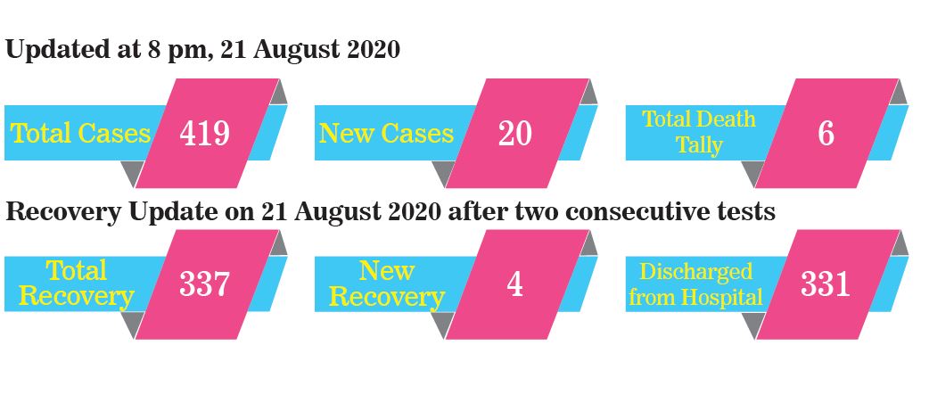 MYANMAR’S COVID-19 positive cases reached 419 after 20 new cases were reported on 21 August according to Ministry of Health and Sports. The case No. 410 had contact with case-377 and case-415,417,418 and 419 with case-395. The others had no contact with positive cases and overseas travel history. Out of the 419 confirmed cases, six died, 337 have recovered, 331 have been discharged from hospitals and 45 were held under investigation.—MNA