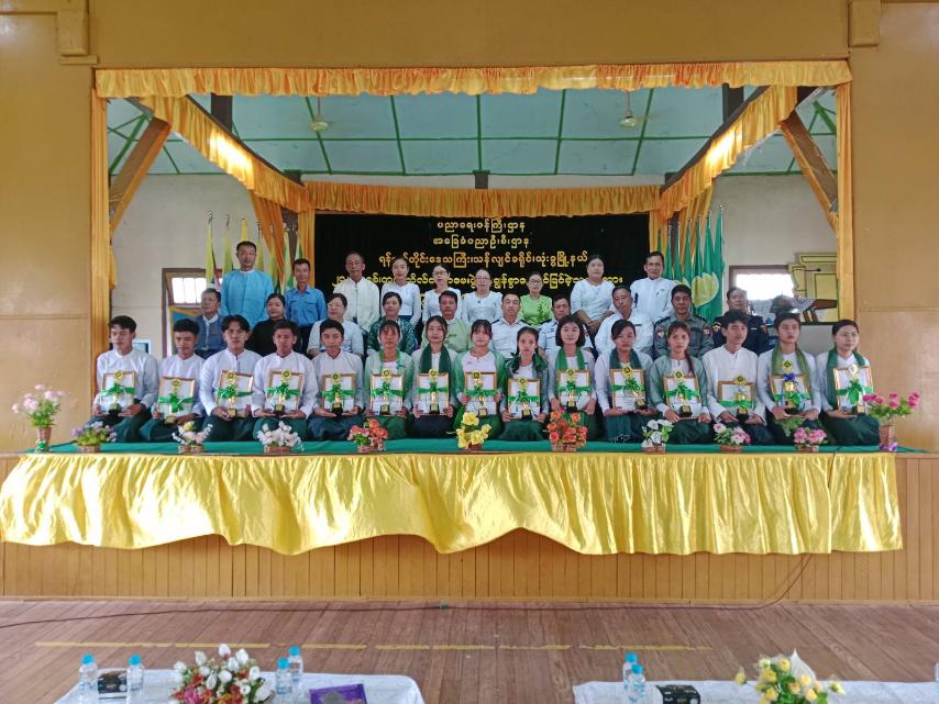 Under this prize awarding program, a total of 17 students including one student who passed with three distinctions, one student who pass with two distinctions and 15 students who pass with one distinction received honorary awards respectively. After that officials and outstanding students pose for a documentary group photo.—Kyaw San