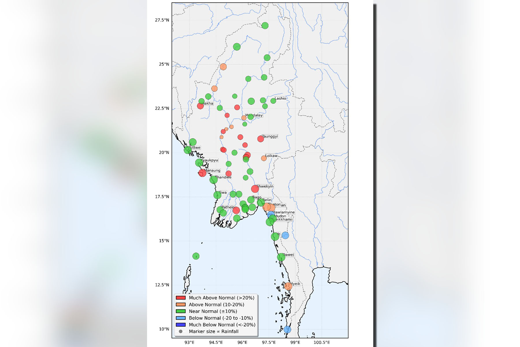 A notable finding of this analysis is that some historically dry stations recorded rainfall classified as "above normal" or "much above normal" compared to their local decadal av­erages. For instance, although total rainfall volumes remain low, towns like Pakokku (700 millimetres), Minbu (700 millimetres) in the Magway Region, and Shwebo (950 millimetres) in the Sagaing Region experienced rainfall five per cent to 10 per cent above their ten-year averages. This suggests that the anomalous 2025 monsoon conditions were sufficient to generate increased rainfall even in the central Dry Zone.