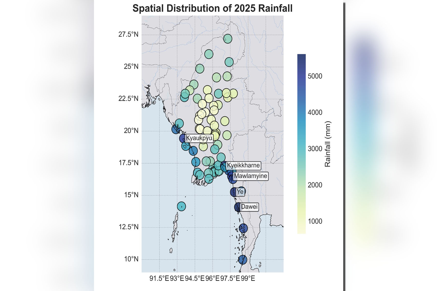 Despite the overall increase in rainfall for most of the country in 2025, the spatial distribution largely followed Myanmar's in­herent geographical precipitation pattern. The coastal regions of Taninthayi, Mon, and Rakhine, being perennially humid zones, re­ceived rains as usual, with Dawei recording 5,600 millimetres and Gwa (Rakhine) recording 5,400 millimetres. Conversely, the arid central Dry Zone, including stations like Myingyan (Mandalay) and Chauk (Magway), received minimal rainfall of only 650 millimetres. The geographical contrast between these areas resulted in a remarkable precipitation ratio of approximately 8.6:1, highlighting the nature of extreme weather phenomena associated with global climate change. In essence, 2025 was a year that visibly manifested abnormal weather conditions, such as high-intensity rainfall over short periods and a reduced number of rainy days, processes linked to climate change.