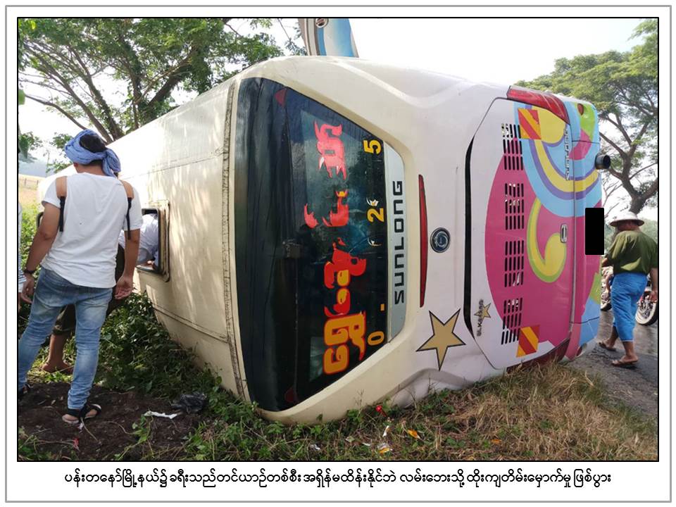 The accident took place when a passenger bus driven by a man identified as Aung Moe Thant, 39 years old flipped over between mileposts 61/4 and 61/5 on the Yangon-Pathein Road in Pantanaw Township, Ayeyawady Region at about 2:05 p.m. on 27 October after the driver lost control of the vehicle. 22 passengers were hurt in the incident.