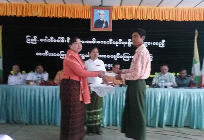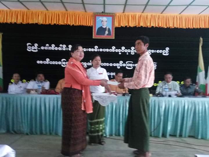 Concerned officials then presented more than Ks. 329 million for 174.08 acres of farmland at the rate of Ks. 2 million for per acre of paddy land and Ks. 1.5 million for per acre of farmland to 246 peasants from seven village-tracts.—Than Htut Aung (IPRD)
