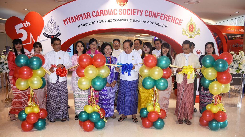 The opening ceremony of the 5th Myanmar Cardiac Society Conference was held at the Lotte Hotel in Yangon yesterday morning. At the ceremony, Union Minister Dr. Myint Htwe said the conference was an opportunity for young doctors from Myanmar to share and learn from the experiences of local and foreign cardiologists as the forum will cover a wide range of matters in the field of cardiovascular medicine, which, as everyone is aware, has seen wide ranging and rapid advances. “The most important point is to view and conduct the forum from the standpoint of public health. The public health sector needs to strategically support treatment to reduce problems related to cardiac health. Only when the public health sector and the treatment sector have discussed and agreed upon a framework of processes, and experts from both sectors work closely and enthusiastically can there be success in reducing the incidence of cardiovascular disease,” said the Union Minister.