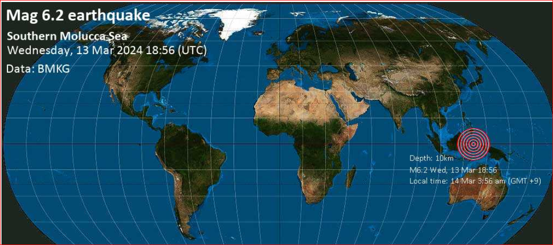 An earthquake with a magnitude of 6.2 struck off North Sulawesi province in central Indonesia early Thursday, the country's meteorology, climatology and geophysics agency said.