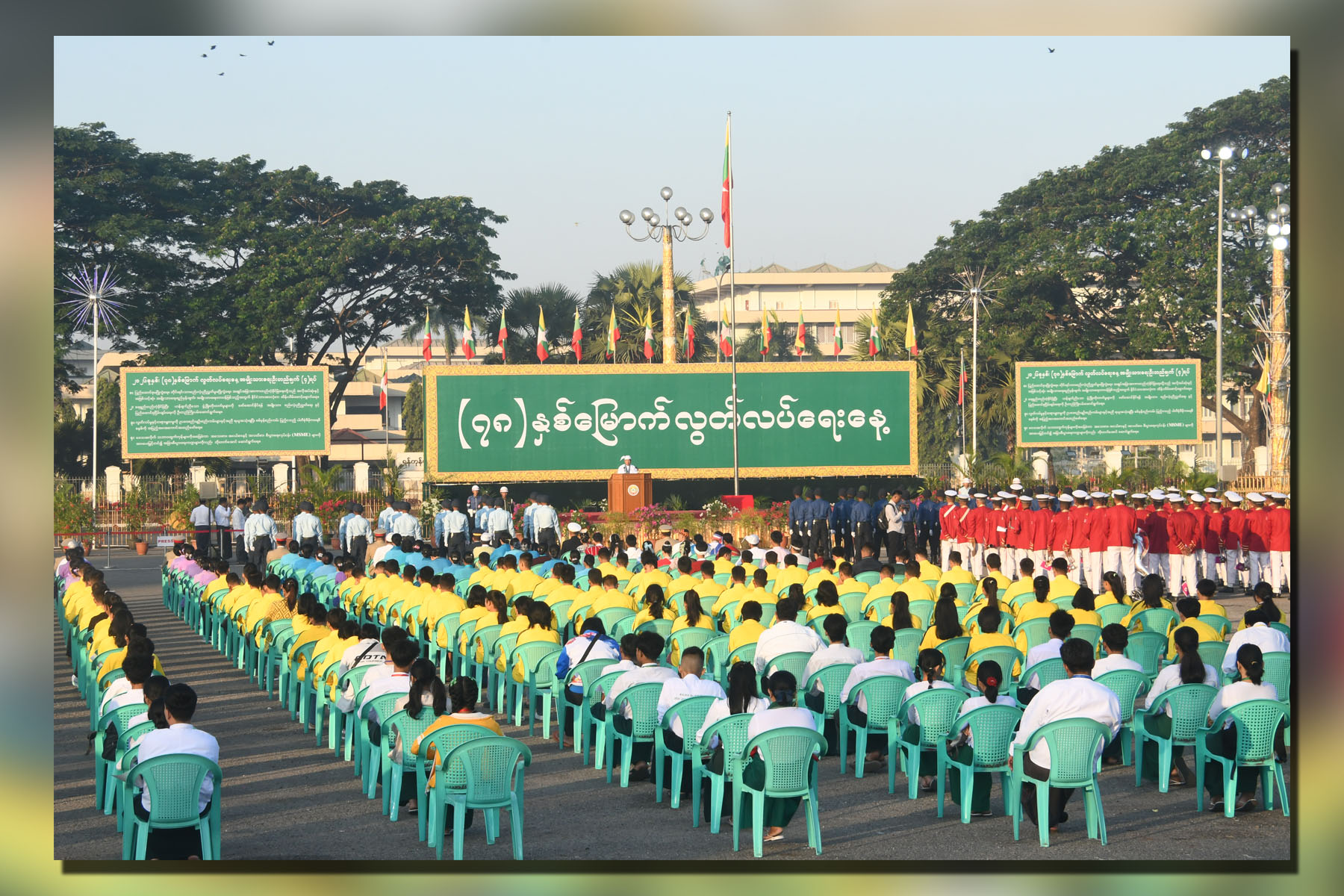 At 7 am, the flag saluting ceremony was organized and Yangon Region Chief Minister U Soe Thein took the salute of the Guard of Honour. He then saluted the State Flag together with the Guard of Honour and attendees to the event.