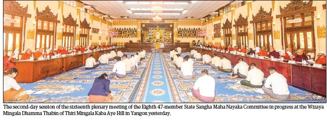 The second-day session of the sixteenth plenary meeting of the Eighth 47-member State Sangha Maha Nayaka Committee was held at the Wizaya Mingala Dhamma Thabin of Thiri Mingala Kaba Aye Hill in Yangon yesterday.