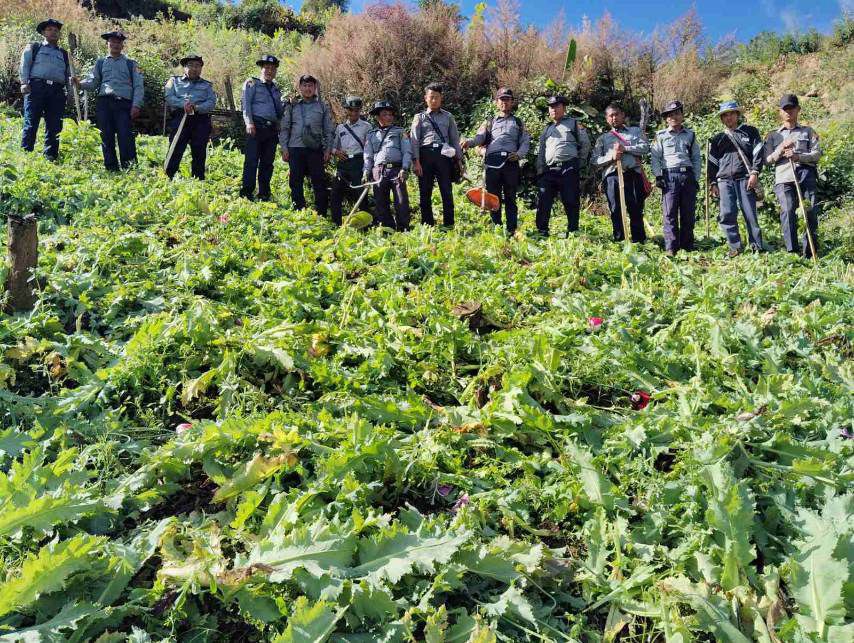 A combined team comprising Police Superintendent Htay Aung, the secretary of the Township Administration Body and police members, Police Sub-inspector Sai Min from the office of the Pa-O Self-Administered Zone Police Command, police members from Taunggyi Anti-Drugs Squad-25, Tatmadaw members from Hopong, officials from the Township General Administration Department, Agriculture Department, Fire Services Department, Department of Land Records, Department of Forest and Department of Health jointly eradicated 12 acres of poppy fields located about two furlongs west of Pankhat Village in Hopong Township, the Pa-O Self-Administered Zone of Southern Shan State.