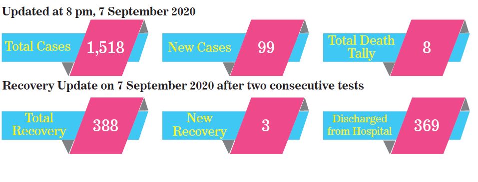 MYANMAR’S COVID-19 positive cases rise to 1,518 after 99 new cases were reported on 7 September according to Ministry of Health and