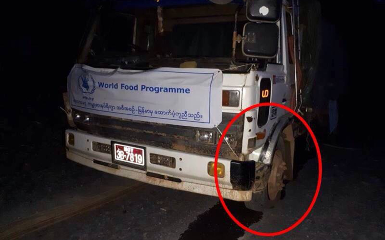 Due to the attacks, U Win Ko Aung, the driver of WFP living in Pakokku Township, was wounded on his face by pieces of wind screen, and fuel tank and wind screen of his car were damaged by small arms.