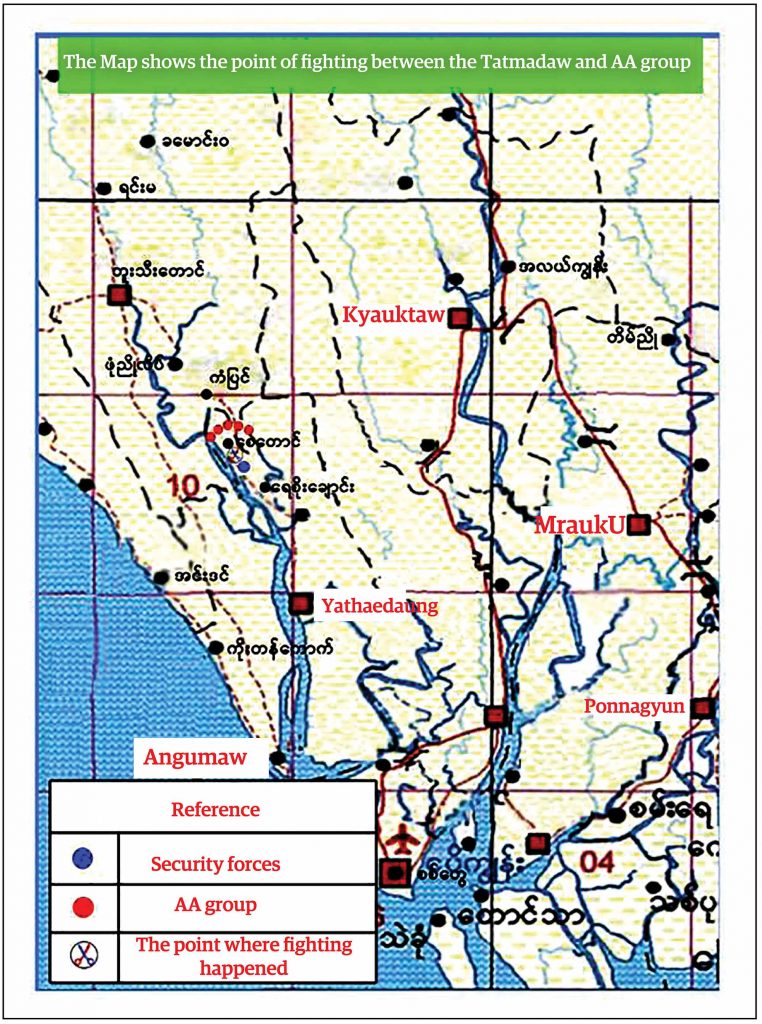 The Tatmadaw column was attacked by the AA group in a location between Yaygaungchaung Village and Setaung Village in Yathedaung Township around 9:30 p.m. on 21 March, About 150 AA personnel launched attacks from five positions north of Setaung Village. The Tatmadaw column fought back and was reported to be continuing appropriate regional security operation.