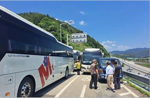 Four school trip buses, three trucks and one passenger car collided one after another at about 1:26 p.m. local time on a road in Hongcheon county, some 100 km east of the capital Seoul.