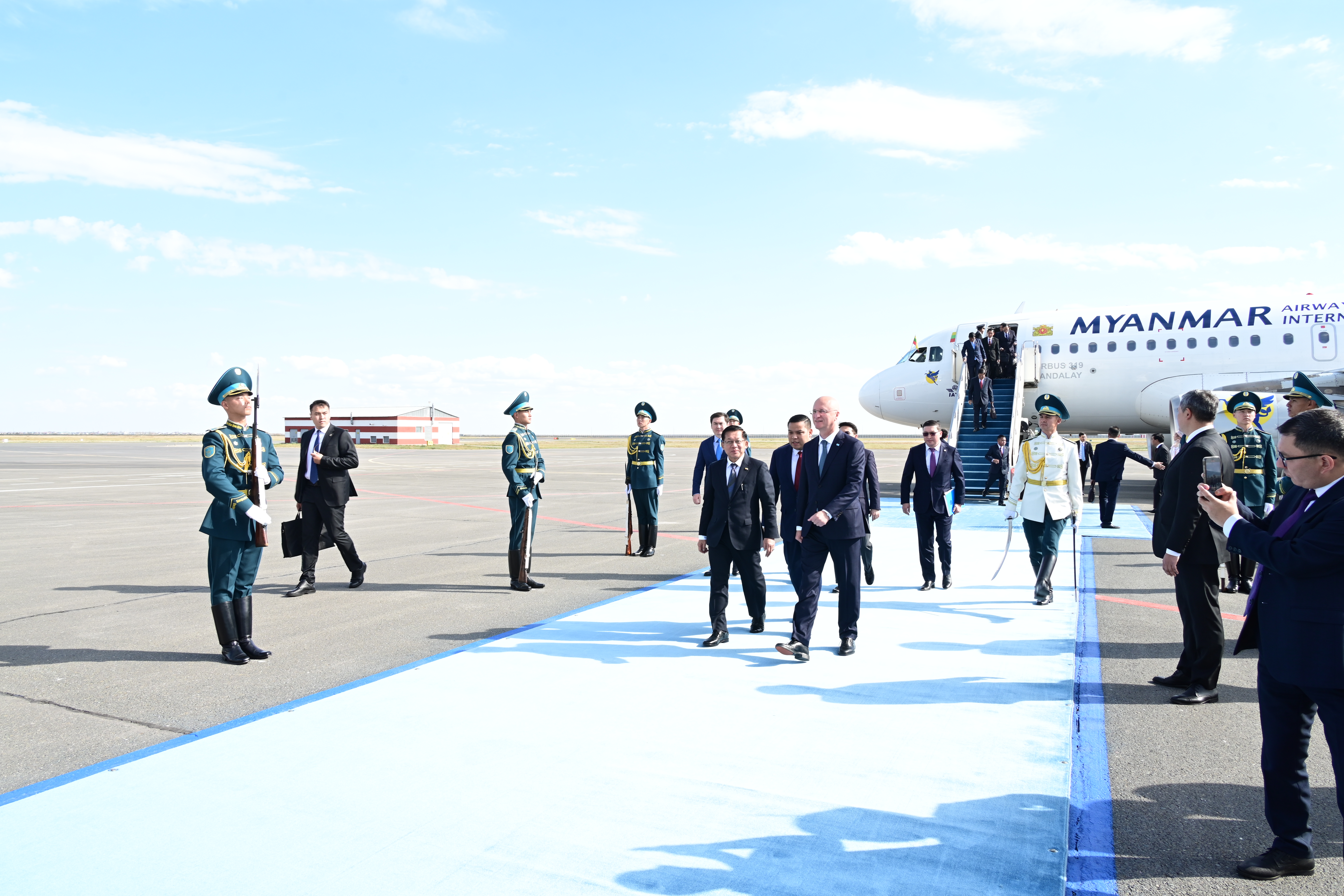 On arrival at the Astana Airport, the high-level Myanmar delegation led by the Acting President and SSPC Chairman of the Republic of the Union of Myanmar was warmly welcomed by Mr Roman Sklyar, First Deputy Prime Minister of the Republic of Kazakhstan, Ambassador of the Republic of Kazakhstan to Myanmar Mr Margulan Baimukhan and officials.