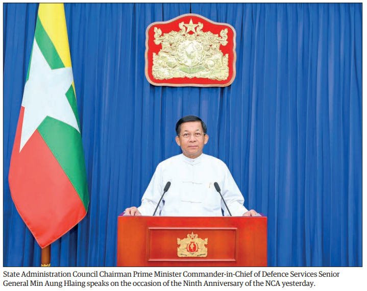 Address delivered by State Administration Council Chairman, Prime Minister of Republic of Union of Myanmar, National Solidarity and Peacemaking Central Committee Chairman, and Commander-in-Chief of Defence Services Senior General Min Aung Hlaing at NCA’s Ninth Anniversary