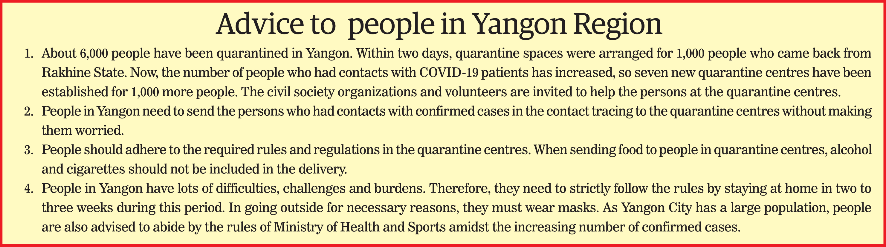 People in Yangon have lots of difficulties, challenges and burdens. Therefore, they need to strictly follow the rules by staying at home in two to three weeks during this period. In going outside for necessary reasons, they must wear masks. As Yangon City has a large population, people are also advised to abide by the rules of Ministry of Health and Sports amidst the increasing number of confirmed cases.
