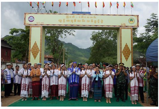 At the event, Amyotha Hluttaw speaker Mann Win Khaing Than made an opening speech, followed by a presentation about the construction work on the newly-built concrete road. Then, Amyotha Hluttaw speaker, union minister, Kayin state chief minister Nan Kin Htwe Myint, MP U Sein Bo of Pyithu Hluttaw and General Saw Moshe from DKBA cut a ribbon to formally open the road.