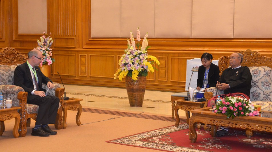 Amyotha Hluttaw Speaker Mahn Win Khaing Than received Ambassador of Canada Mr Francois Lafreniere at the reception hall of Amyotha Hluttaw building in Nay Pyi Taw yesterday.