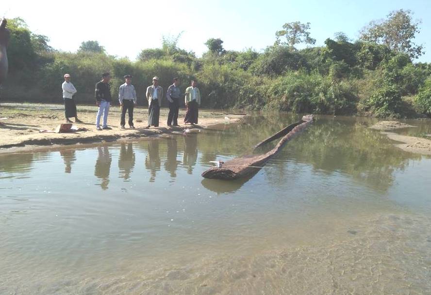 Upon receiving information about the discovery of an ancient wooden boat, a combined police squad from Lewe Myoma Police Station rushed to the scene to check it. The boat, which is 62 feet long and about 10 inch in circumference, was raised from Yone Pin Creek near Thebyu Village in Lewe Township, at around 11 a.m. on January 19.