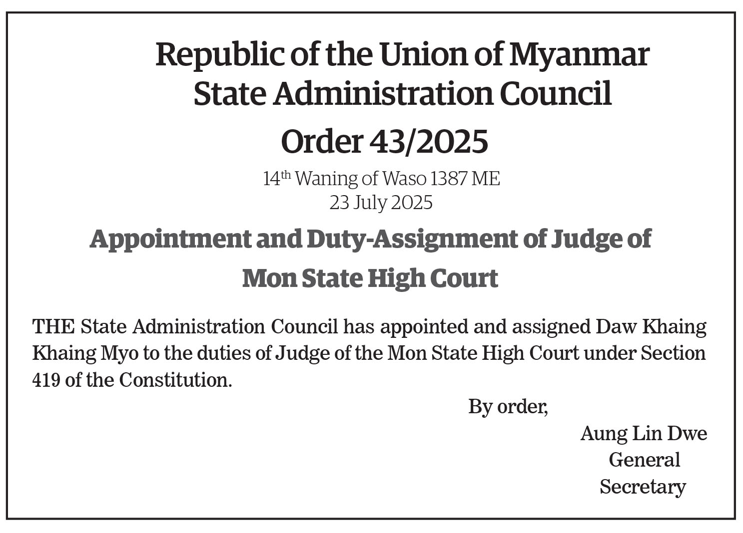 Appointment and Duty-Assignment of Judge of Mon State High Court