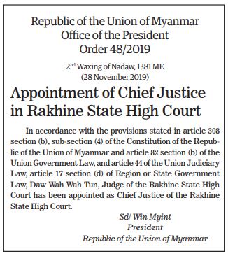Appointment of Chief Justice in Rakhine State High Court