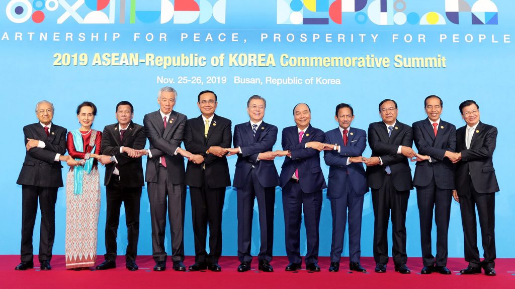 State Counsellor Daw Aung San Suu Kyi attended the ASEAN-Republic of Korea Commemorative Summit in Busan to mark the 30th anniversary of their dialogue relations, the opening ceremony of ASEAN-ROK Startup Summit and Innovation Showcase 2019, bilateral meeting of Myanmar and ROK and signing MoUs in fisheries, vocational trainings and environmental conservation sectors between the two countries. The State Counsellor arrived at the Busan Exhibition and Convention Center at 9:15 am local time to attend the Summit. She was welcomed by President Mr Moon Jae-in and posed for documentary photos with the President, leaders of ASEAN member countries and heads of government ministries.
