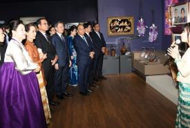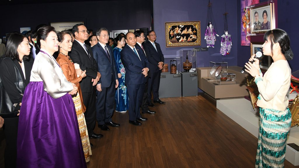 The State Counsellor then proceeded to the ASEAN Cultural House in Busan, and looked around the cultural exhibitions of Cambodia, Laos, Viet Nam, Thailand and Myanmar, together with President Moon Jae-in and the First Lady Kim Jung-sook, leaders of ASEAN countries and heads of government ministries.