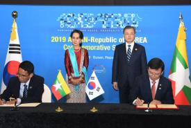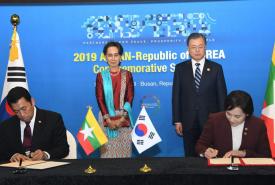 State Counsellor Daw Aung San Suu Kyi and President Moon Jae-in witnessed signing MoUs for fishery sector, vocational training programmes and environmental conservation between Myanmar and the ROK.