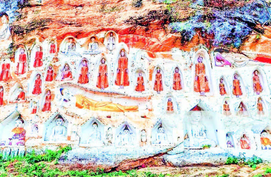 Another famous is Akauk Taung. Akauk Taung is a mountain extending from Pyay District to Hinthada District, renowned for its numerous ancient Buddha images carved into the rock wall along the Ayeyawady River bank. Historically, the mountain served as a tollgate for passing boats and ships. Artisans carved the mountain walls, resulting in 370 Buddha images depicted in various positions standing, sitting and lying. Most of these Buddha images date back to the Konbaung era, with some originating from the Inwa era.