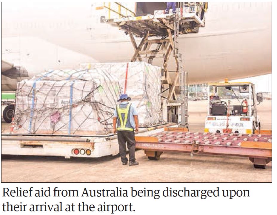 THE government of Myanmar has swiftly con­ducted damage assessments in earthquake-af­fected areas and is carrying out timely rescue operations. Meanwhile, humanitarian aid from overseas is being received for the people af­fected by the earthquake. The aid materials, donated by the Australian government arrived yesterday morning at Yangon International Airport.