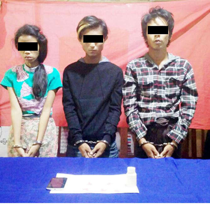 Acting on a tip-off, police members from Kyaukpadaung Myoma Police Station searched the house of Ma Han Ni Aye in Myoma Ward in Kyaukpadaung at about 2:05 am today and arrested three suspected drug pushers, identified as Mah Han Ni Aye, 35, Hein Moe Oo, 26, and Soe Lwin Myo, 20, along with 51 stimulant tablets weighing 5.1 grams worth K 153000 and a mobile phone.