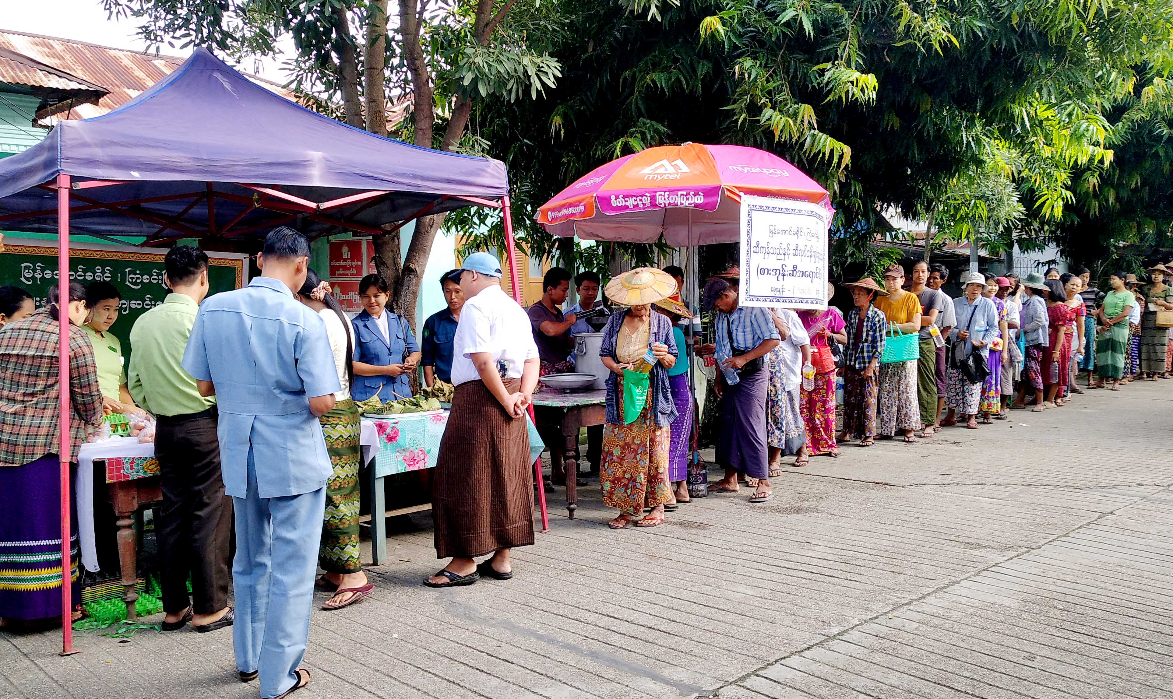 During the event, essential food products were sold at subsidized rates in collaboration with local business owners. Prices included: Five eggs for 2,000 kyats, fifty ticals of palm oil for 3,500 kyats and twenty-five ticals of pork or beef for 5,000 kyats.