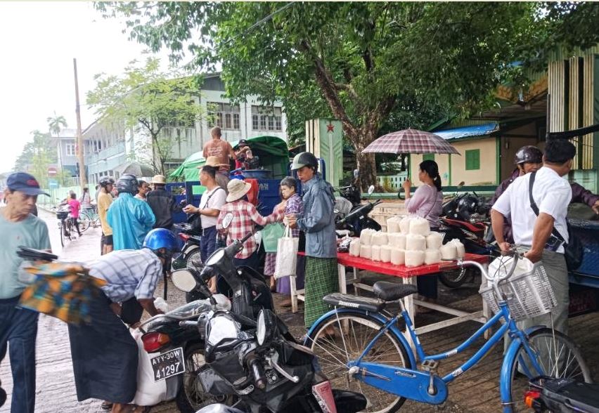 Essential food items were sold at fair prices to local residents this morning at two locations in Maubin Township, Ayeyarwady Region: in front of the local fire station in Ward 3 and in front of Toe Shwewa Hall in Ward 4.