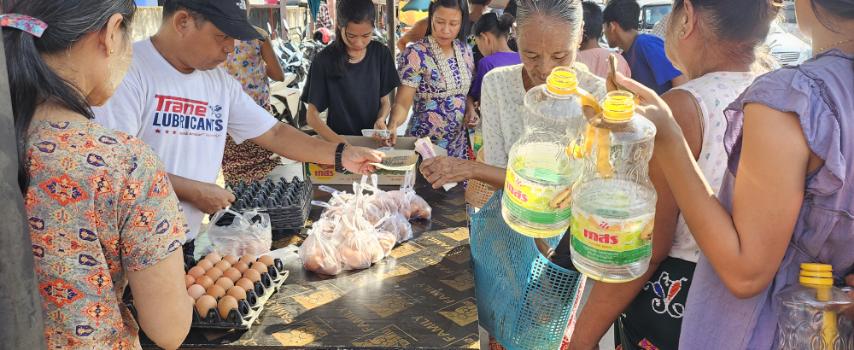 Essential food items were sold at affordable prices this morning at Mingalar Market in Ka Da Ward, Paung Township, Mon State, as part of an effort to ease the cost of living for local residents.