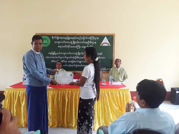 Then, U Wai Lin Maung, head of the Township Rural Development Department clarified the purpose of the course, which was followed by handing out completion certificates and certificates of honor to trainees and outstanding trainees by U Soe Naing.