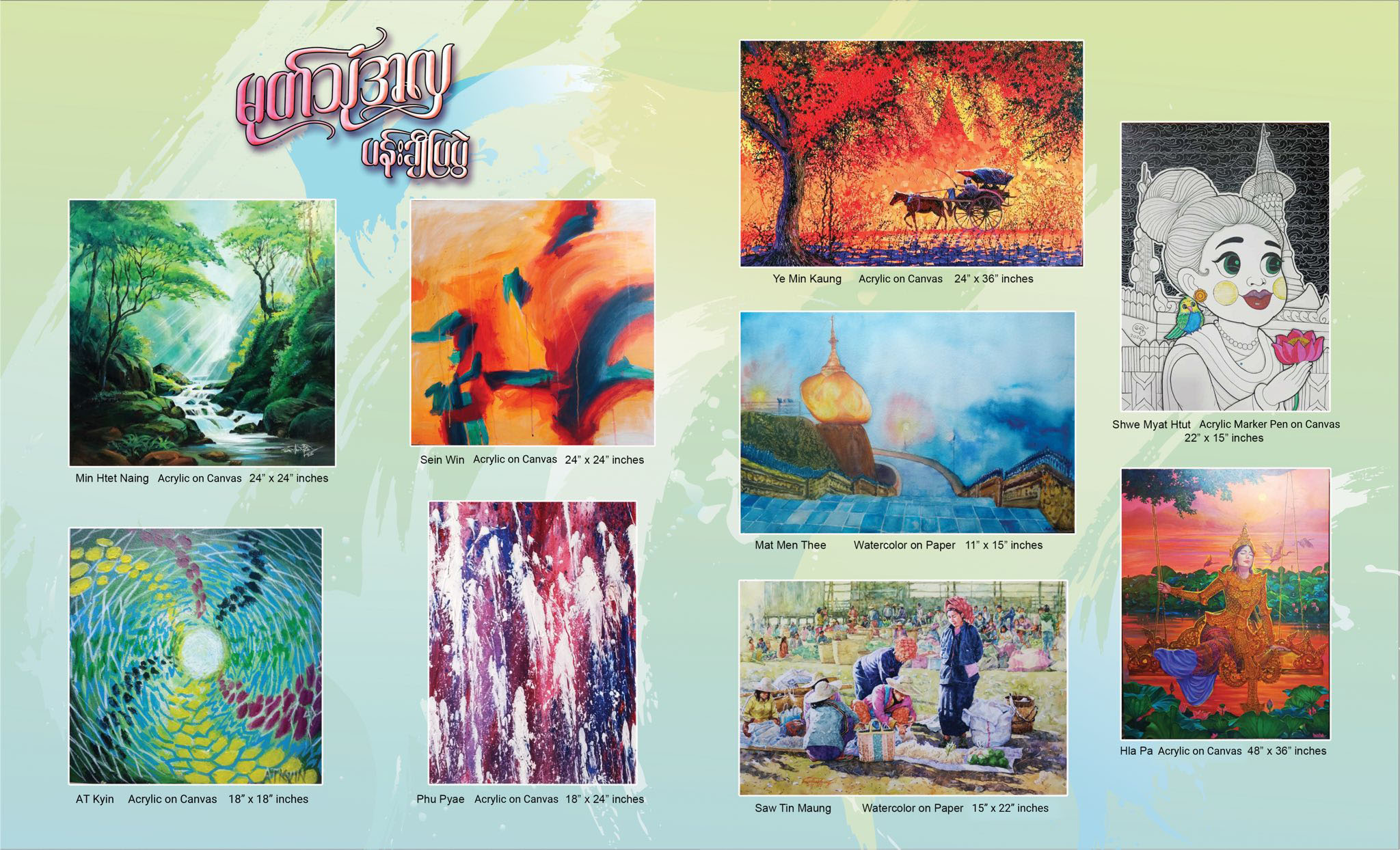 The exhibition feature more than 70 paintings by artists Myat Han, Hlaing One, Htay Myint, Win Min Mg, A T Kyin, Tun Win (Guava), Shan Lay, Ye Min Kaung, Saw Tin Maung, Sein Win, Shwe Myat Htut, Mat Men Thee, Min Htet Naing, Hla Pa, and Phu Pyae, created in various media such as ink, oil, and acrylic.