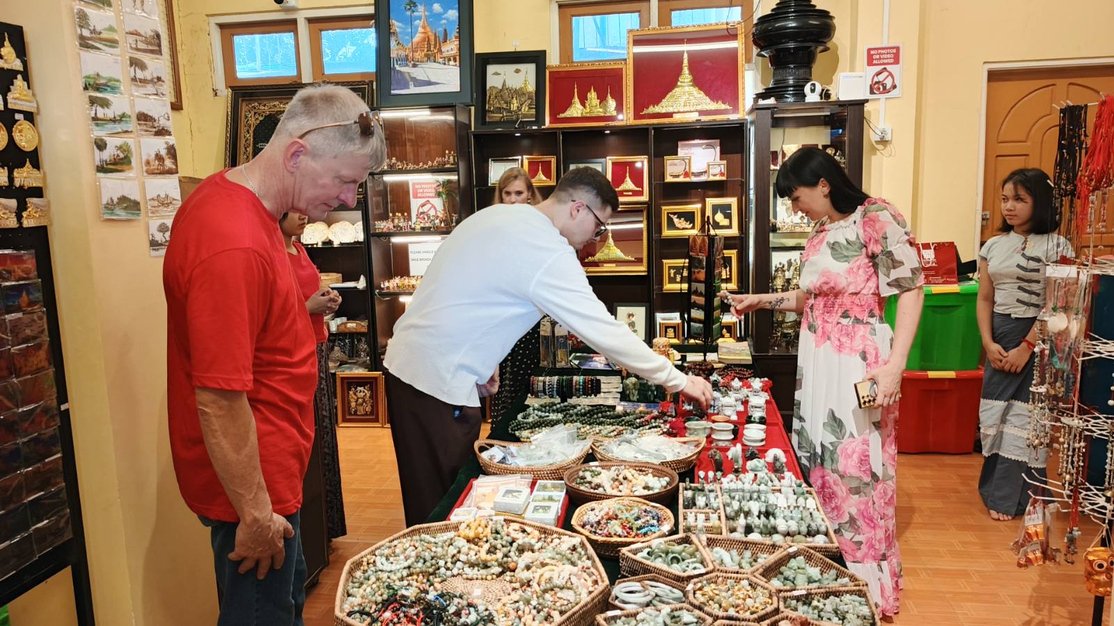 The entertainment troupe first arrived at the Shwedagon Pagoda, where they were welcomed by the trustees and offered flowers, water, and oil lamps to the pagoda. Afterwards, they visited the Jade Buddha image and viewed the exhibits in the Buddhist Museum with interest. They then took a group photo at victorious Landplot and offered water to the pagoda. Finally, after examining the King Thayawady Bell, they visited the souvenir shop to buy souvenirs.