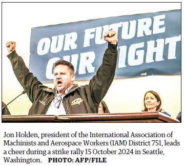 A strike by 33,000 IAM Union District 751 workers in Washington state halted production at two Seattle-area Boeing plants, significantly affecting the 737 MAX assembly. — AFP