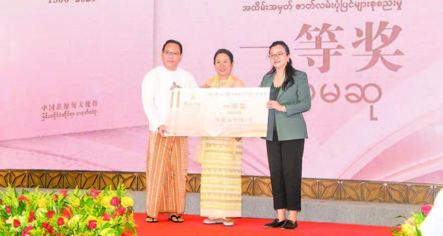 The Chinese Ambassador presented awards to the recipients of the outstanding, third, and second prizes. The Union minister and the Ambassador presented the first prize to writer Tekkatho Mya Minzu, author of “Yangtze, Ayeyawady Enduring Forever”.