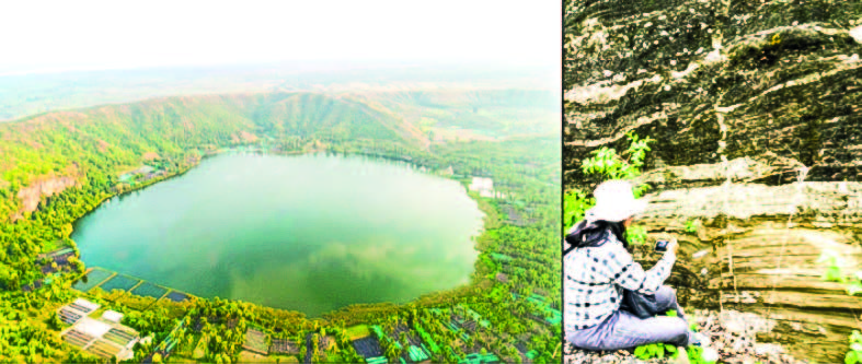 Songyaung: On the right bank of the Chindwin River, opposite Alon and two miles east of Songyaung, is a low hill extending in a north-west-south-east direction, with gentle slopes on all sides except the north, where it ends abruptly over a shallow lake, with a scarp about 100 feet in height. This lake is deeply truncated near the northeastern side and marks the site of an extinct crater. That part of the hill that abuts the river, according to Sondhi, is composed of highly jointed, comparatively fresh, dark, olivine basalt. A little way from the river, the basalt becomes highly scoriaceous and vesicular. Farther west, it is replaced by a very characteristic bed, about six feet thick, of lapilli cemented by a sparse amount of volcanic ash. To the southwest of the lapilli bed occur several unconsolidated beds of basaltic tuff, with many quartz pebbles, sand, and fossil wood.