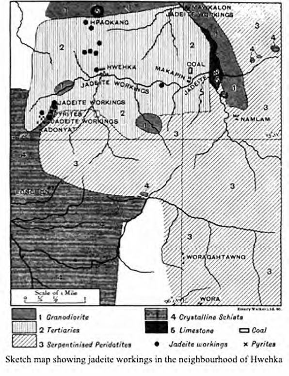 Area and Extent.: The area so far known at present in which the mineral jadeite is found in Burma is situated between 25° 28’and 25° 52’N latitude and 96° 7’and 96° 24’E longitude. The coordinates given above include the main, well-known area which supplies almost the entire output of jadeite obtained in Burma. However, there are other places where jadeite is known to exist: one locality lies about ten miles east of Mohnyin (24° 46’50”, 96° 22’30”), and another one occurs on the bank of the Chindwin River (might be Khamti region). Jadeite also exists about 200 miles north of Myitkyina, but the place is inaccessible, and the quality of the jadeite is reported to be poor.