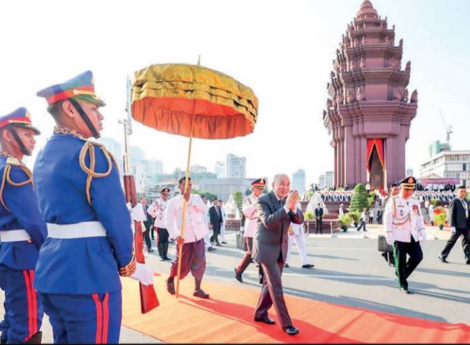 During the commemoration, Sihamoni laid a wreath and lit the ceremonial victory fire inside the Independence Monument to symbolize the country's independence.