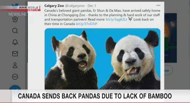 A Canadian zoo has returned two giant pandas to China,as it cannot obtain enough bamboo to feed them, owing to the coronavirus pandemic.