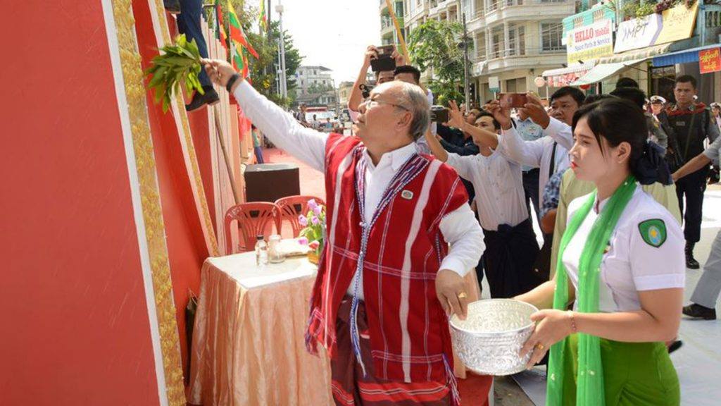 Afterwards Amyotha Hluttaw Speaker Mahn Win Khaing Than and party went to attend the opening ceremony of the Martyr’s Park gateway at the Martyr’s Park, Bogyoke Road, Ward 1, Myawady Town. At this opening ceremony Thone Yaung Chal (Tricolor) dance troupe and Nyein Chan Silone (Peace and Unity) dance troupe provided entertainment with dances.