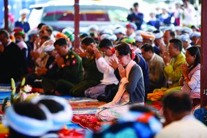 State Counsellor Daw Aung San Suu Kyi attended a ceremony to enshrine religious objects in the Maha Bodhi pagoda located on Poe Panta pagoda hillock in Kyauktalonegyi Town of Taunggyi District in southern Shan State yesterday morning, together with well-wishers of alms-offering to Buddhist monks.