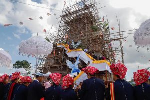 Next, the State Counsellor, the Union Ministers, the Chief Minister, the Deputy Ministers, officials, well-wishers and congregation conveyed the religious objects for enshrinement, and then the donors and devotees enshrined the objects in the pagoda.