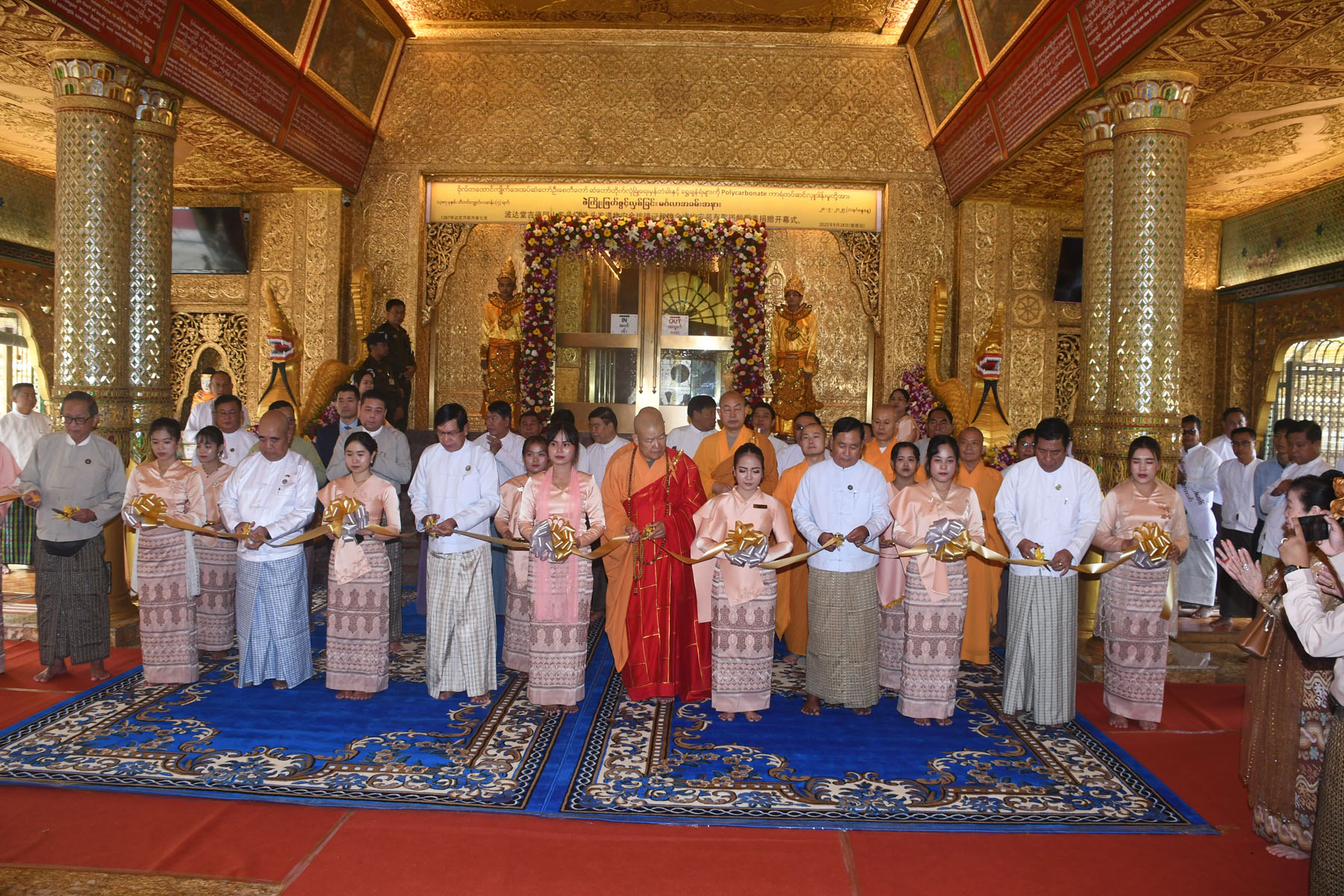 Yangon Region Chief Minister U Soe Thein, Deputy Minister for Religious Affairs and Culture U Aye Tun, Yangon Region Minister for Social Affairs U Htay Aung, Chairman of the Myanmar-China Friendship Association (Central) U Tin Oo, and members of the pagoda board of trustees opened and viewed the newly installed polycarbonate walls.